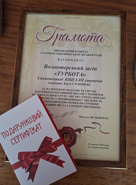 З нагоди 816-ї річниці Старокостянтинова виконавчий комітет Старокостянтинівської міської ради відзначив грамотою та цінним подарунком волонтерський загін «Турбота» Сахновецької ЗОШ І-ІІІ ступенів за патріотизм та відданість справі, колективний внесок у розвиток волонтерського руху, високу громадянську свідомість і сподвижницьку діяльність. Дякуємо!